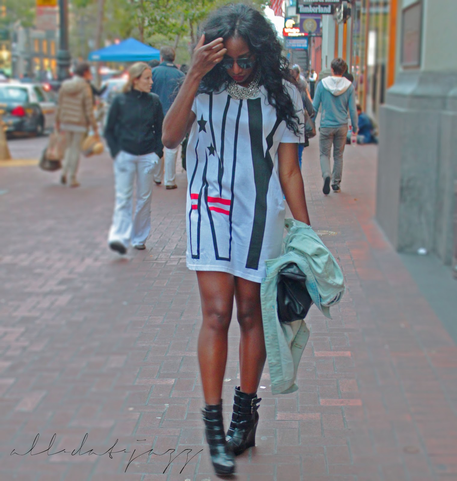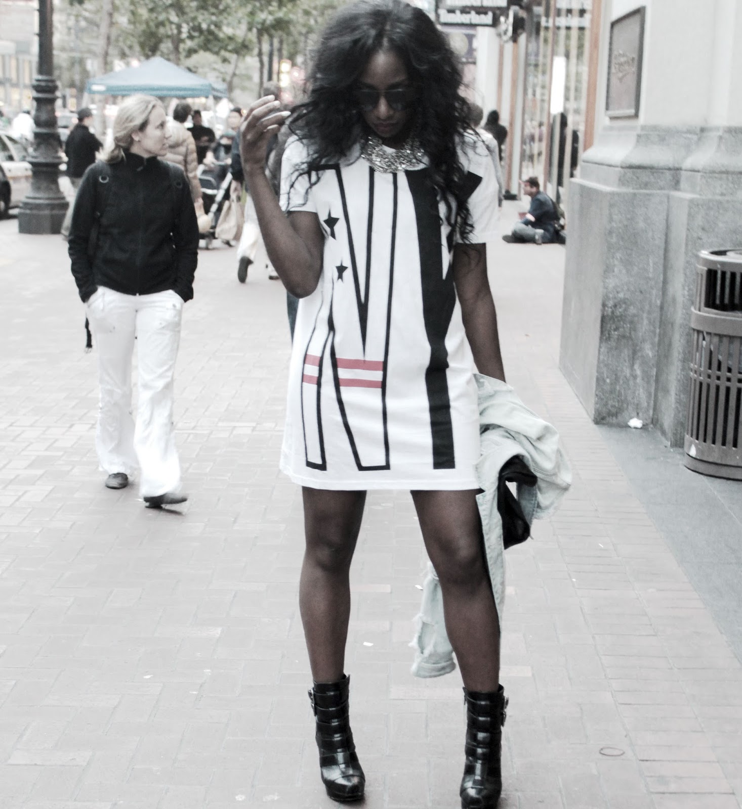 T-Shirt Dress- H&M; Necklace- H&M; Boots- Alice & Olivia; Bag- Zara
